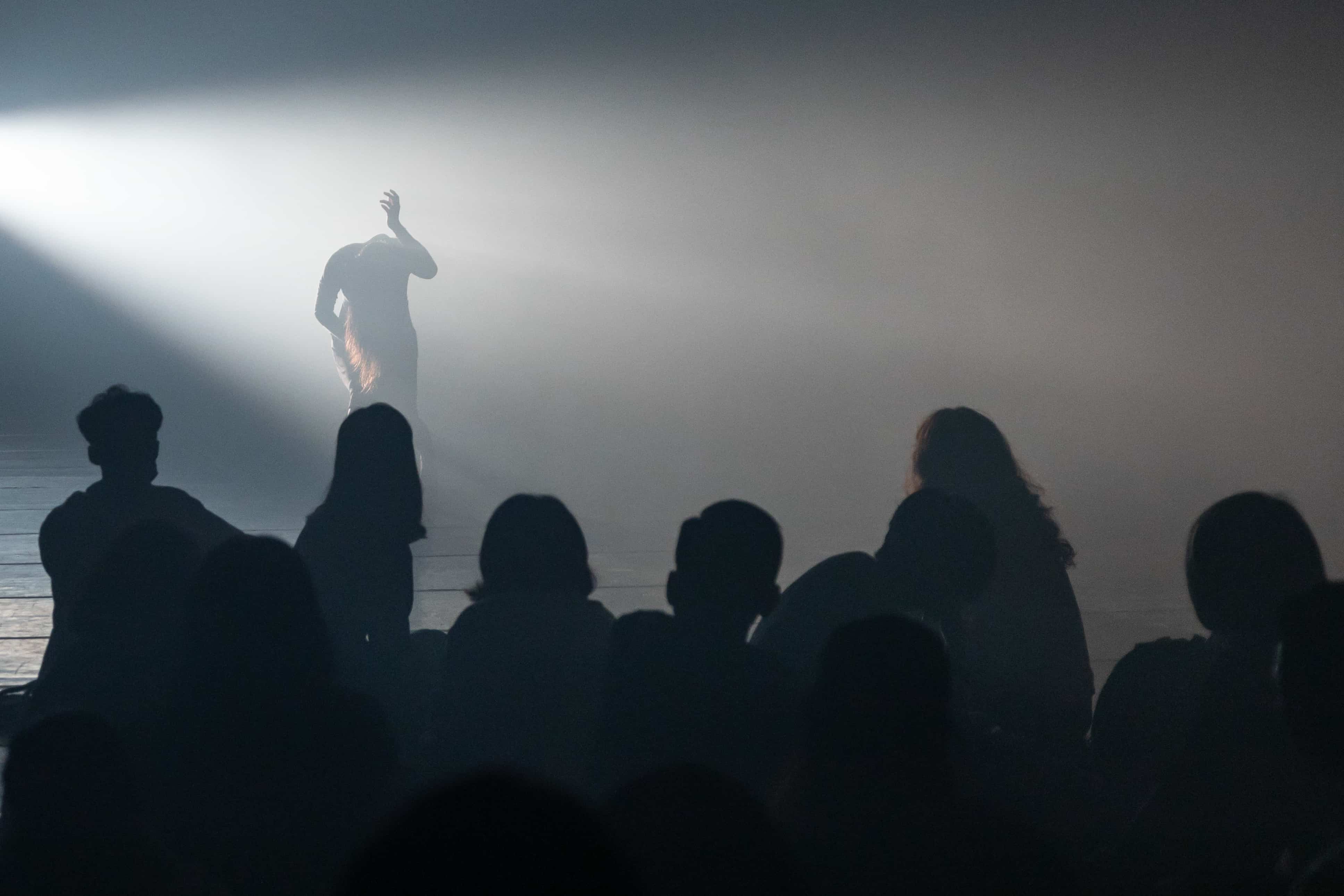 ©劉振祥當孝慈走進人群,聚光燈的銳利光線不僅形塑出她孑然無依的孤獨身影,同時也映襯出觀者眾目具瞻的輪廓。《群眾》的光影變化不只聚焦在表演者身上,燈光設計有時會透過聚光燈的移動或折射去突顯觀眾的側影,讓他們在無形之中融入場景、參與演出,成為《群眾》的一份子。